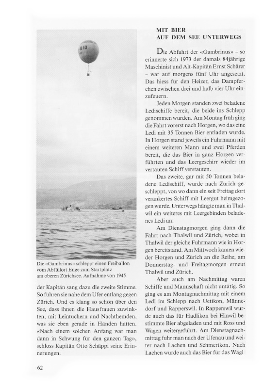 Die «Gambrinus» ist das älteste noch im Originalzustand erhaltene Schiff auf dem Zürichsee, das einst gewerblichen Zwecken diente. Die offizielle Jubiläumsfeier «100 Jahre Gambrinus» findet am Samstag, 21. August 1993, auf dem Landgut von Paul Weber-Glystras in der Rietliau Wädenswil statt. Im Hinblick auf die denkwürdige Feier ist auch diese kleine Geschichte des legendären Schleppers verfasst worden.