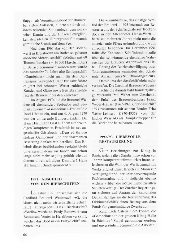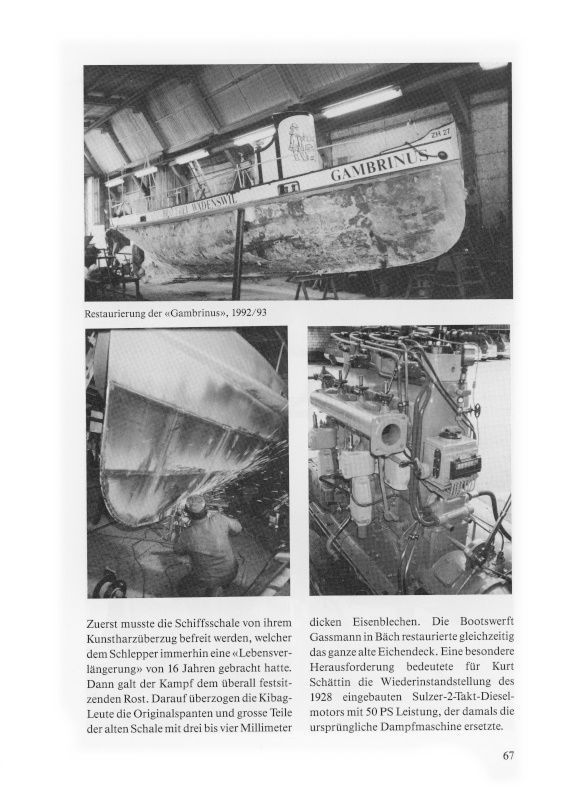 In den strahlenden Farben Weiss, Blau und Rot -während Jahren die Hausfarben der Brauerei Wädenswil – und mit der ebenso langjährigen Originalbeschriftung an Steuerstand und Rumpf dürfte die nunmehr hundertjährige «Gambrinus» mit der Bootsnummer ZH 27 am weissen Bug für weitere Jahrzehnte zur gefreuten Erscheinung auf dem Zürichsee gehören. Paul Weber hat nämlich mit dem Kanton Zürich, vertreten durch die Direktion der öffentlichen Bauten, am 15. Mai 1993 einen Vertrag abgeschlossen, wonach er sich als Gegenleistung für den Subventionsbeitrag verpflichtet, das Motorschiff «Gambrinus» für die Dauer von zwanzig Jahren in seinem heutigen historischen Zustand zu erhalten. Das Schiff soll oft gefahren werden. Ab Herbst 1993 wird es – mindestens zehn Mal pro Jahr – an Gesellschaften bis 12 Personen vermietet.