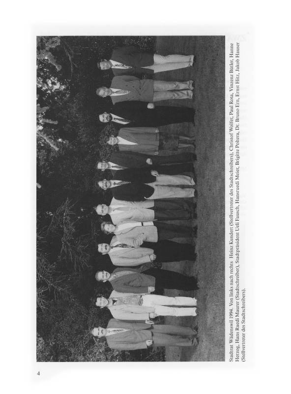 4 Stadtrat Wädenswil 1994. Von links nach rechts: Heinz Kundert (Stellvertreter des Stadtschreibers), Christof Wolfer, Paul Rota, Vinzenz Bütler, Hanne Herzog, Hans Ruedi Maurer (Stadtschreiber), Stadtpräsident Ueli Fausch, Hansruedi Meier, Brigitte Poltera, Dr. Bruno Ern, Ernst Hitz, Jakob Hauser (Stellvertreter des Stadtschreibers).