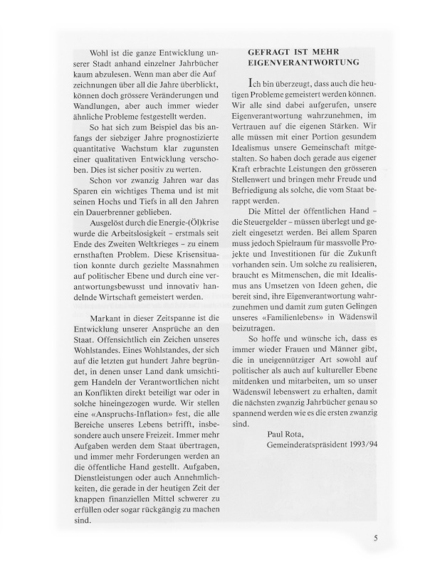 So hoffe und wünsche ich, dass es immer wieder Frauen und Männer gibt, die in uneigennütziger Art sowohl auf politischer als auch auf kultureller Ebene mitdenken und mitarbeiten, um so unser Wädenswil lebenswert zu erhalten, damit die nächsten zwanzig Jahrbücher genau so spannend werden wie es die ersten zwanzig sind.