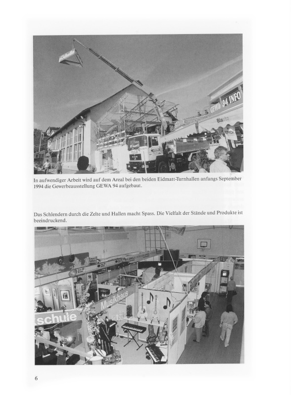 3 Vom 8. bis 11. September 1994 fand in sechs Hallen auf dem Eidmattareal in Wädenswil die Gewerbeausstellung GEWA 94 statt, eine eindrückliche Leistungsschau von über 150 örtlichen Handwerks-, Gewerbe- und Dienstleistungsbetrieben. Sie wurde von mehr als 50 000 Personen besucht.