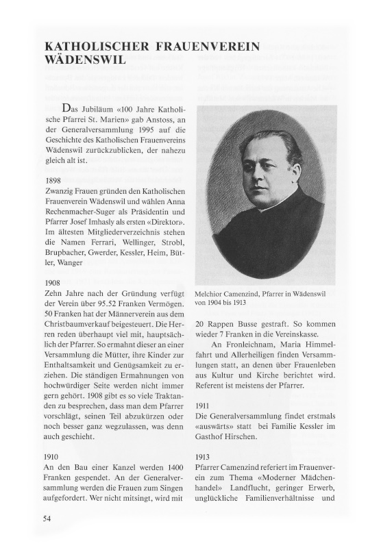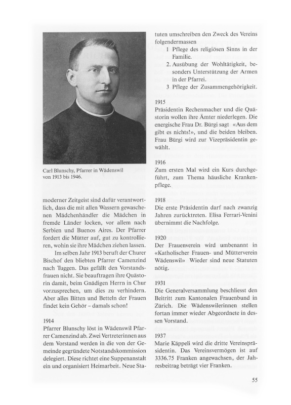 Johanna Ferrari-Büttiker übernimmt den Vorsitz im Verein und spornt die Mitglieder zu tatkräftiger Mithilfe an. Ihr zur Seite stehen Pfarrer Risi, der dem Katholischen Frauen- und Mütterverein seit dem Tod von Pfarrer Blunschy im Jahre 1946 als Präses vorsteht.