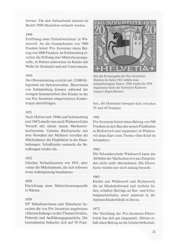 Einführung eines für den ganzen Pro-Juventute-Bezirk Wädenswil einheitlichen Markenbestellsystems, das der Schule weniger Zeitaufwand, aber Pro Juventute leider einen merklichen Rückgang der Bestellungen beschert.