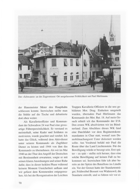 Kavallerieverein die bescheidene Rolle des Leutnant Blattman und seiner Truppe. Paul brachte mich im Spiel gerne in Verlegenheit mit Fragen oder Bemerkungen, die nicht im Text vorgesehen waren. Als beim ersten Auftritt die Pferde in der ungewohnten Umgebung aufgeregt waren, gelang dem Trompeter kein Trompetenstoss. Paul fragte mich: «Chan dänn diin Trompeter nöd blaase?» Worauf ich erwiderte: «Blaase scho, aber nöd riite». Nach dem Auftritt mit meinem Reitertrupp ging’s jeweils ab zum Bügeltrunk in die Dragoner-Stammbeiz «Schwanen». Bei dieser Gelegenheit stiess an einem Abend der «Landvogt» zu uns. Unsere «Eidgenossen» wurden von zwei Pferdehaltern vor dem Wirtshaus betreut. Paul kam in seiner Landvogtmontur herein und herrschte uns an: «Ir hocked gmütli do ine und d Ross lönd er dusse, nämets doch wenigschtens au ine». Und schon wurden unsere Rösser, zum Schrecken der braven Wirtin, in die Gaststube geführt. Bis sie dann in der engen Gaststube gedreht und wieder draussen waren, entstand doch ein rechter Wirbel.
