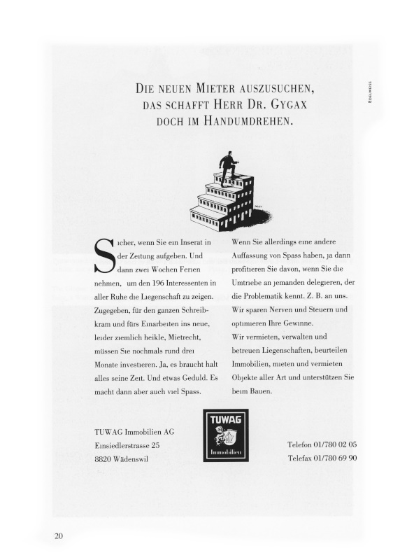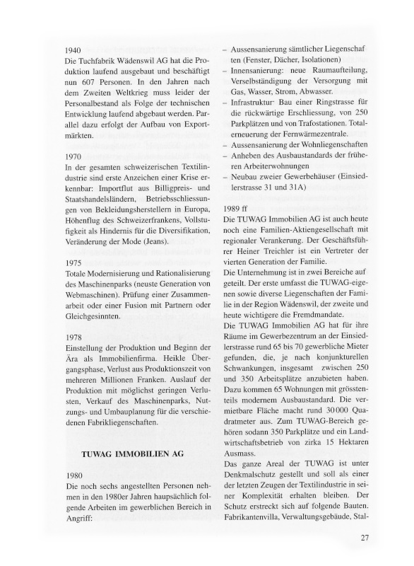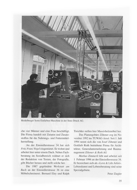 Seit der Gründung im Jahre 1984 betreibt Architekt Konrad Ottinger in der TUWAG-Liegenschaft Einsiedlerstrasse 25, dem einstigen Bürogebäude der Tuchfabrik Wädenswil AG, ein eigenes Architekturbüro.