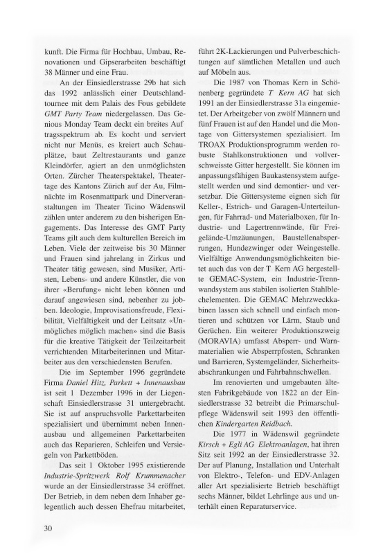 An der Einsiedlerstrasse 29b hat sich das 1992 anlässlich einer Deutschlandtournee mit dem Palais des Fous gebildete GMT Party Team niedergelassen. Das Genious Monday Team deckt ein breites AuftragsspektrumEs kocht und serviert nicht nur Menüs, es kreiert auch Schauplätze, baut Zeltrestaurants und ganze Kleindörfer, agiert an den unmöglichsten Orten. Zürcher Theaterspektakel, Theatertage des Kantons Zürich auf der Au, Filmnächte im Rosenmattpark und Dinerveranstaltungen im Theater Ticino Wädenswil zählen unter anderem zu den bisherigen Engagements. Das Interesse des GMT Party Teams gilt auch dem kulturellen Bereich im Leben. Viele der zeitweise bis 30 Männer und Frauen sind jahrelang in Zirkus und Theater tätig gewesen, sind Musiker, Artisten, Lebens- und andere Künstler, die von ihrer «Berufung» nicht leben können und darauf angewiesen sind, nebenher zu jobben. Ideologie, Improvisationsfreude, Flexibilität, Vielfältigkeit und der Leitsatz «Unmögliches möglich machen» sind die Basis für die kreative Tätigkeit der Teilzeitarbeit verrichtenden Mitarbeiterinnen und Mitarbeiter aus den verschiedensten Berufen.