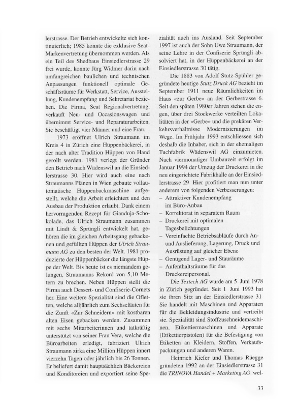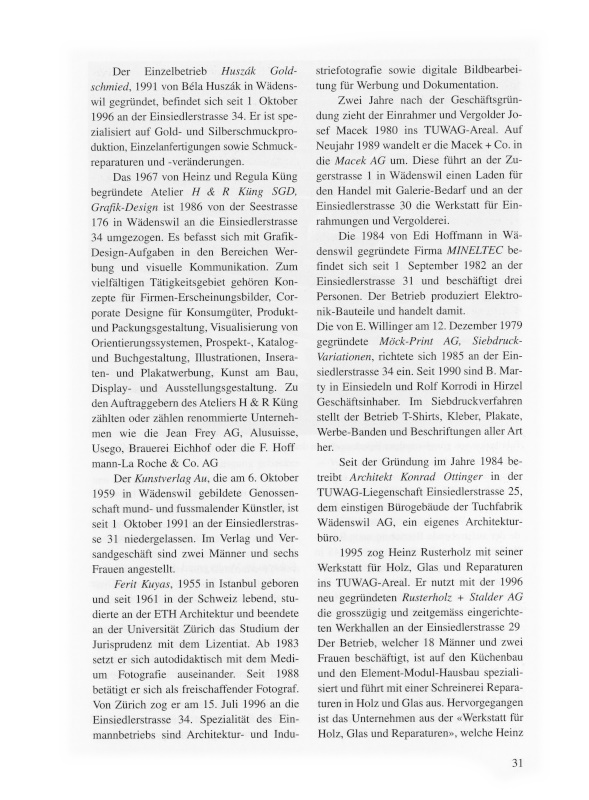 Die im September 1996 gegründete Firma Daniel Hitz, Parkett + Innenausbau ist seit 1. Dezember 1996 in der Liegenschaft Einsiedlerstrasse 31 untergebracht. Sie ist auf anspruchsvolle Parkettarbeiten spezialisiert und übernimmt neben Innenausbau und allgemeinen Parkettarbeiten auch das Reparieren, Schleifen und Versiegeln von Parkettböden.