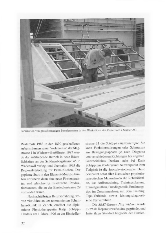 1995 zog Heinz Rusterholz mit seiner Werkstatt für Holz, Glas und Reparaturen ins TUWAG-Areal. Er nutzt mit der 1996 neu gegründeten Rusterholz + Stalder AG die grosszügig und zeitgemäss eingerichteten Werkhallen an der Einsiedlerstrasse 29. Der Betrieb, welcher 18 Männer und zwei Frauen beschäftigt, ist auf den Küchenbau und den Element-Modul-Hausbau spezialisiert und führt mit einer Schreinerei Reparaturen in Holz und Glas aus. Hervorgegangen ist das Unternehmen aus der «Werkstatt für Holz, Glas und Reparaturen», welche Heinz Rusterholz 1983 in den 1890 geschaffenen Arbeitsräumen seiner Vorfahren an der Stegstrasse 1 in Wädenswil eröffnete. 1987 wurde der aufstrebende Betrieb in neue Räumlichkeiten an der Schönenbergstrasse 45 in Wädenswil verlegt und übernahm 1995 die Regionalvertretung für Piatti-Küchen. Der geplante Start in den Element-Modul-Hausbau erforderte dann eine neue Firmenstruktur und gleichzeitig zusätzliche Produktionsstätten, die an der Einsiedlerstrasse 29 vorhanden waren.