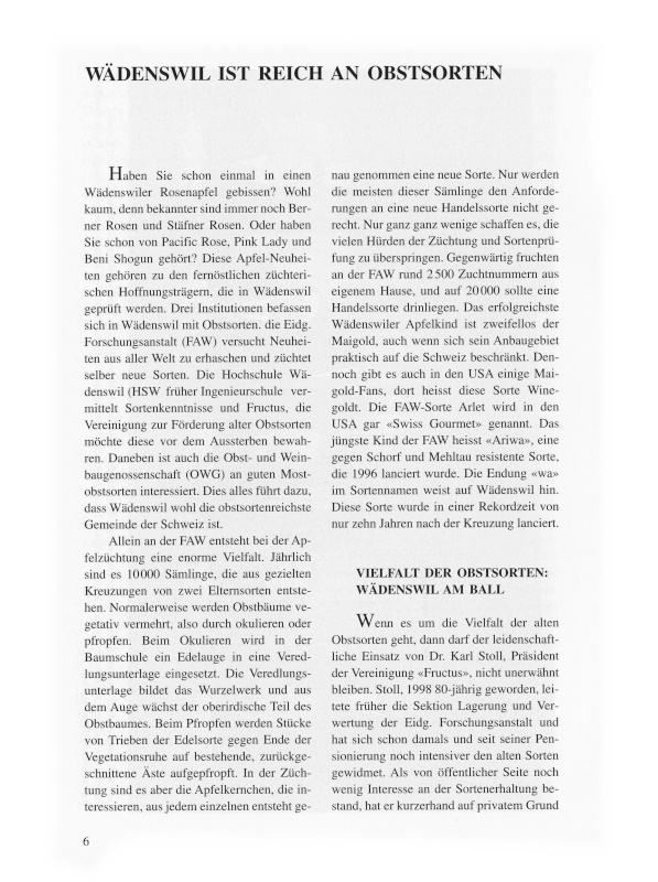 Wenn es um die Vielfalt der alten Obstsorten geht, dann darf der leidenschaftliche Einsatz von Dr. Karl Stoll, Präsident der Vereinigung «Fructus», nicht unerwähnt bleiben. Stoll, 1998 80-jährig geworden, leitete früher die Sektion Lagerung und Verwertung der Eidgenössischen Forschungsanstalt und hat sich schon damals und seit seiner Pensionierung noch intensiver den alten Sorten gewidmet.