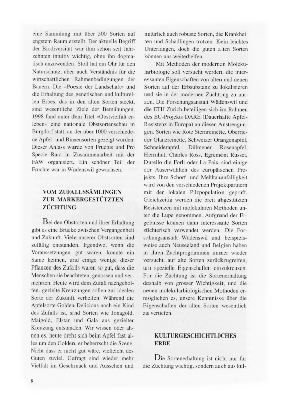Mit Methoden der modernen Molekularbiologie soll versucht werden, die interessanten Eigenschaften von alten und neuen Sorten auf der Erbsubstanz zu lokalisieren und sie in der modernen Züchtung zu nutzen. Die Forschungsanstalt Wädenswil und die ETH Zürich beteiligen sich im Rahmen des EU-Projekts DARE (Dauerhafte Apfel-Resistenz in Europa) an diesen Anstrengungen. Sorten wie Rote Sternreinette, Oberrieder Glanzreinette, Schweizer Orangenapfel, Schneiderapfel, Dülmener Rosenapfel, Herrnhut, Charles Ross, Egremont Russet, Durello die Forli oder La Paix sind einige der Auserwählten des europäischen Projekts. Ihre Schorf- und Mehltauanfälligkeit wird von den verschiedenen Projektpartnern mit der lokalen Pilzpopulation geprüft. Gleichzeitig werden die breit abgestützten Resistenzen mit molekularen Methoden unter die Lupe genommen. Aufgrund der Ergebnisse können dann interessante Sorten züchterisch verwendet werden. Die Forschungsanstalt Wädenswil und beispielsweise auch Neuseeland und Belgien haben in ihren Zuchtprogrammen immer wieder versucht, auf alte Sorten zurückzugreifen, um spezielle Eigenschaften einzukreuzen. Für die Züchtung ist die Sortenerhaltung deshalb von grosser Wichtigkeit, und die neuen molekularbiologischen Methoden ermöglichen es, unsere Kenntnisse über die Eigenschaften der alten Sorten wesentlich zu vertiefen.
