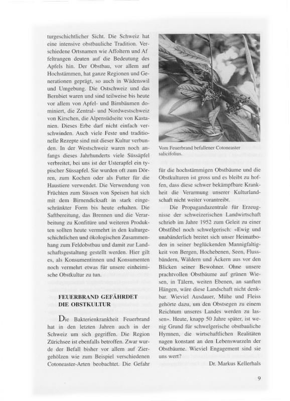 Die Bakterienkrankheit Feuerbrand hat in den letzten Jahren auch in der Schweiz um sich gegriffen. Die Region Zürichsee ist ebenfalls betroffen. Zwar wurde der Befall bisher vor allem auf Ziergehölzen wie zum Beispiel verschiedenen Cotoneaster-Arten beobachtet. Die Gefahr für die hochstämmigen Obstbäume und die Obstkulturen ist gross und es bleibt zu hoffen, dass diese schwer bekämpfbare Krankheit die Verarmung unserer Kulturlandschaft nicht weiter vorantreibt.