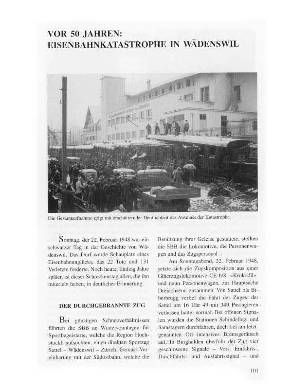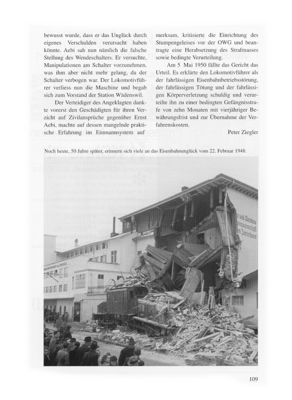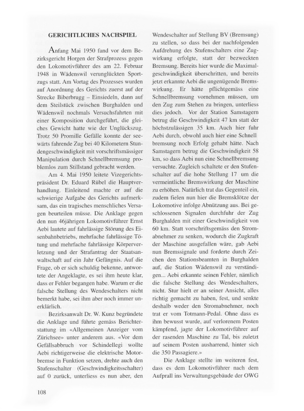 Anfang Mai 1950 fand vor dem Bezirksgericht Horgen der Strafprozess gegen den Lokomotivführer des am 22. Februar 1948 in Wädenswil verunglückten Sportzugs statt. Am Vortag des Prozesses wurden auf Anordnung des Gerichts zuerst auf der Strecke Biberbrugg–Einsiedeln, dann auf dem Steilstück zwischen Burghalden und Wädenswil nochmals Versuchsfahrten mit einer Komposition durchgeführt, die gleiches Gewicht hatte wie der Unglückszug. Trotz 50 Promille Gefälle konnte der seewärts fahrende Zug bei 40 Kilometern Stundengeschwindigkeit mit vorschriftsmässiger Manipulation durch Schnellbremsung problemlos zum Stillstand gebracht werden.
