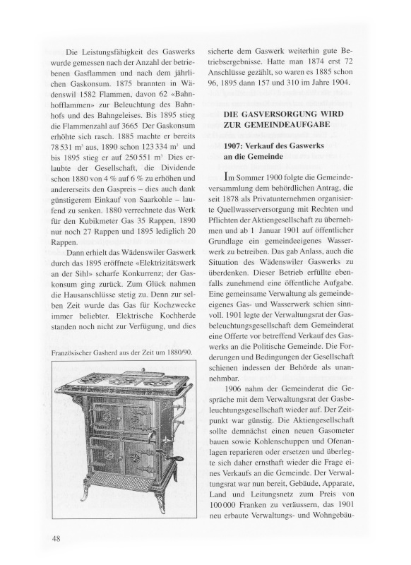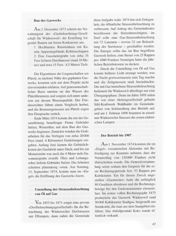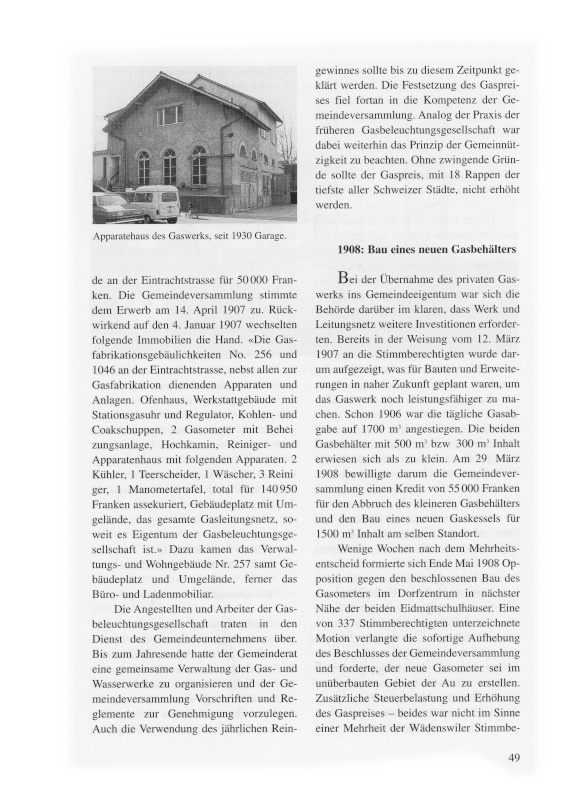 Ofenhaus, Werkstattgebäude mit Stationsgasuhr und Regulator, Kohlen- und Coakschuppen, 2 Gasometer mit Beheizungsanlage, Hochkamin, Reiniger- und Apparatenhaus mit folgenden Apparaten: 2 Kühler, 1 Teerscheider, 1 Wäscher, 3 Reiniger, 1 Manometertafel, total für 140 950 Franken assekuriert, Gebäudeplatz mit Umgelände, das gesamte Gasleitungsnetz, soweit es Eigentum der Gasbeleuchtungsgesellschaft ist.» Dazu kamen das Verwaltungs- und Wohngebäude Nr. 257 samt Gebäudeplatz und Umgelände, ferner das Büro- und Ladenmobiliar.