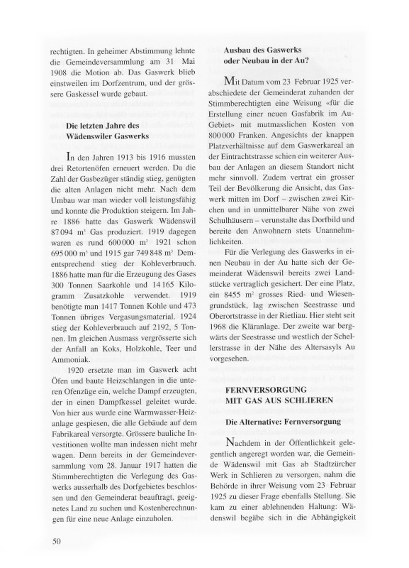 Trotz solcher Bedenken sprach sich die Gemeindeversammlung vom 29. März 1925 – einem Mehrheitsantrag der Rechnungsprüfungskommission folgend – mit 565 gegen 193 Stimmen für die Ferngasversorgung aus und ermächtigte den Gemeinderat, mit der Stadt Zürich einen Gaslieferungsvertrag abzuschliessen. Gleichzeitig erhielt die Behörde den Auftrag, in der Rietliau einen Gasometer von 4000 m3 Inhalt zu erstellen und die Liquidation des Gaswerks an der Eintrachtstrasse in die Wege zu leiten.