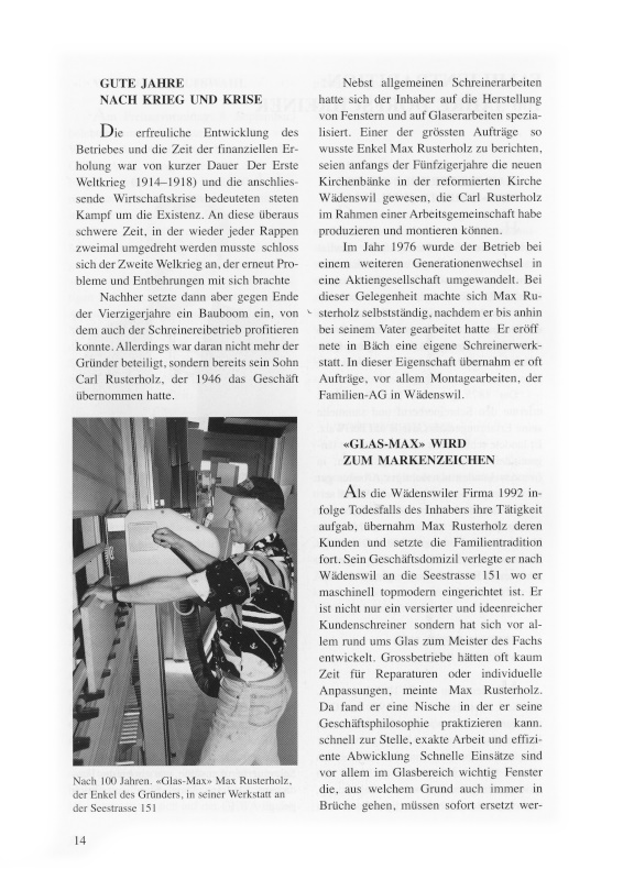 Als die Wädenswiler Firma 1992 infolge Todesfalls des Inhabers Ihre Tätigkeiten aufgab, übernahm Max Rusterholz deren Kunden und setzte die Familientradition fort. Sein Geschäftsdomizil verlegte er an die Seestrasse 151, wo er maschinell topmodern eingerichtet ist. Er ist nicht nur ein versierter und ideenreicher Kundenschreiner, sondern hat sich vor allem rund ums Glas zum Meister des Fachs entwickelt. Grossbetriebe hätten oft kaum Zeit für Reparaturen oder individuelle Anpassungen, meinte Max Rusterholz. Da fand er eine Nische, in der er seine Geschäftsphilosophie praktizieren kann: schnell zur Stelle, exakte Arbeit und effiziente Abwicklung. Schnelle Einsätze sind vor allem im Glasbereich wichtig. Fenster, die aus welchem Grund auch immer, in die Brüche gehen, müssen sofort ersetzt werden. Das kann sogar mitten in der Nacht sein, wenn er von der Polizei nach einem Einbruch für eine Notverglasung aufgeboten wird. Max Rusterholz liebt seinen Beruf. Mit Freude geht er jeden Tag an seine Arbeit und hofft natürlich, dass das ehrbare Handwerk, das er ausübt, wenn es Zeit ist einen Nachfolger aus seiner Familie findet, damit die Tradition auch in Zukunft fortgesetzt werden kann.