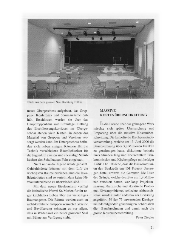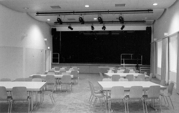Die Bühne befindet sich neu zwischen grossem und kleinem Saal und kann von beiden Seiten benützt und eingesehen werden. Die durch eine Faltwand vom grossen Saal getrennte Küche ist nicht vergrössert, aber mit besseren Geräten ausgestattet worden. Über dem bestehenden Saal wurde ein neues Obergeschoss aufgebaut, das Gruppen-, Konferenz- und Seminarräume enthält. Erschlossen werden sie über das Haupttreppenhaus mit Liftanlage. Entlang des Erschliessungskorridors im Obergeschoss stehen viele Kästen, in denen das Material von Gruppen und Vereinen versorgt werden kann. Im Untergeschoss befinden sich neben einigen Räumen für die Technik verschiedene Räumlichkeiten für die Jugend. In zweien sind ehemalige Schulküchen des Schulhauses Fuhr eingebaut.