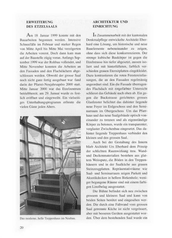 Mitte der 1990er Jahre drängten sich Reparaturarbeiten am bald 40-jährigen Etzelsaal auf. Bei deren Planung kristallisierte sich die Idee heraus, neben der Sanierung auch eine bescheidene Erweiterung auszuführen. Vor allem für Unterricht und Jugendarbeit sollten mehr Räume geschaffen werden. So entstand das Projekt, das 1997 in der Volksabstimmung genehmigt wurde.