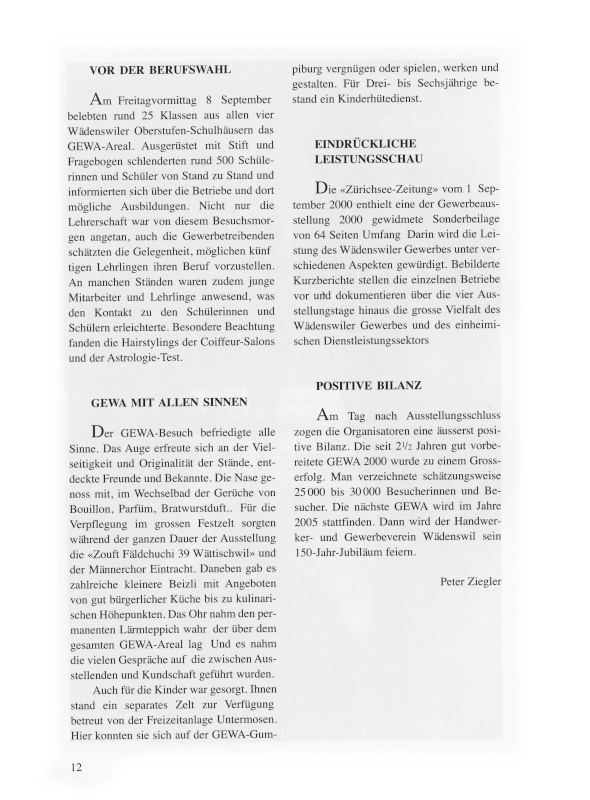 Die «Zürichsee-Zeitung» vom 1. September 2000 enthielt eine der Gewerbeausstellung 2000 gewidmete Sonderbeilage von 64 Seiten Umfang. Darin wird die Leistung des Wädenswiler Gewerbes unter verschiedenen Aspekten gewürdigt. Bebilderte Kurzberichte stellen die einzelnen Betriebe vor und dokumentieren über die vier Ausstellungstage hinaus die grosse Vielfalt des Wädenswiler Gewerbes und des einheimischen Dienstleistungssektors.