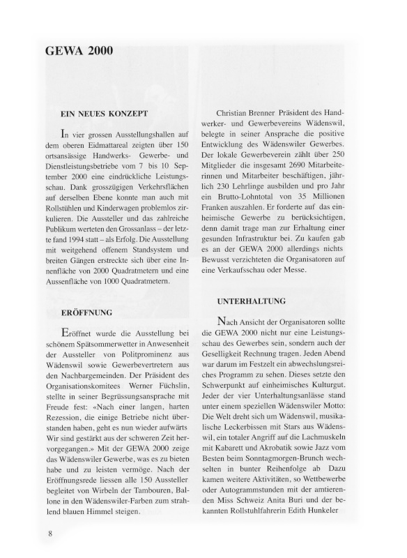 In vier grossen Ausstellungshallen auf dem oberen Eidmattareal zeigten über 150 ortsansässige Handwerks-, Gewerbe- und Dienstleistungsbetriebe vom 7. bis 10. September 2000 eine eindrückliche Leistungsschau. Dank grosszügigen Verkehrsflächen auf derselben Ebene konnte man auch mit Rollstühlen und Kinderwagen problemlos zirkulieren. Die Aussteller und das zahlreiche Publikum werteten den Grossanlass – der letzte fand 1994 statt – als Erfolg. Die Ausstellung mit weitgehend offenem Standsystem und breiten Gängen erstreckte sich über eine Innenfläche von 2000 Quadratmetern und eine Aussenfläche von 1000 Quadratmetern.