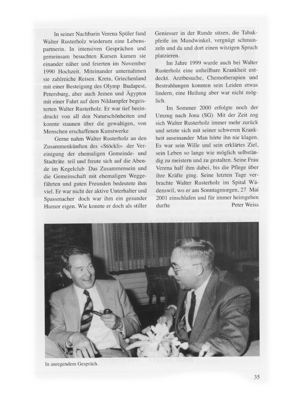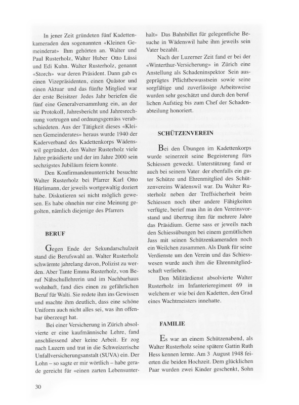 Walter Rusterholz wurde am 7. April 1922 in Wädenswil geboren. Zusammen mit seinem um ein Jahr jüngeren Bruder Paul erlebte er an der Schönenbergstrasse 8 vis-à-vis der reformierten Kirche und der Bäckerei Schärer eine glückliche und abwechslungsreiche Jugendzeit. Beide besuchten den Kindergarten bei der legendären Tante «Mimi» und wurden miteinander im selben Jahr eingeschult, wobei sie nie der gleichen Klasse angehörten: Walti hatte stets die strengeren, Paul die sanftmütigeren Lehrer. Die beiden Brüder wetteiferten miteinander, welcher der Fleissigere, der Gescheitere und der Brävere sei.