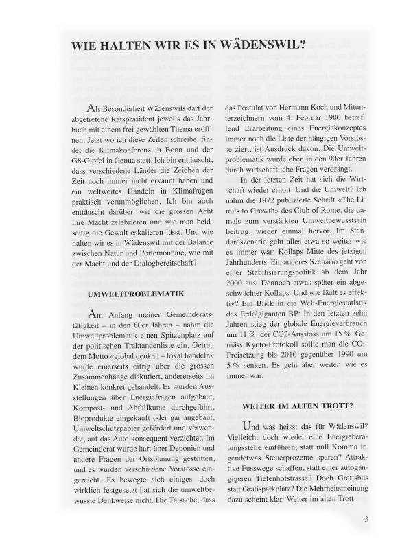 Als Besonderheit Wädenswils darf der abgetretene Ratspräsident jeweils das Jahrbuch mit einem frei gewählten Thema eröffnen. Jetzt wo ich diese Zeilen schreibe, findet die Klimakonferenz in Bonn und der G8-Gipfel in Genua statt. Ich bin enttäuscht, dass verschiedene Länder die Zeichen der Zeit noch immer nicht erkannt haben und ein weltweites Handeln in Klimafragen praktisch verunmöglichen. Ich bin auch enttäuscht darüber, wie die grossen Acht ihre Macht zelebrieren und wie man beidseitig die Gewalt eskalieren lässt. Und wie halten wir es in Wädenswil mit der Balance zwischen Natur und Portemonnaie, wie mit der Macht und der Dialogbereitschaft?