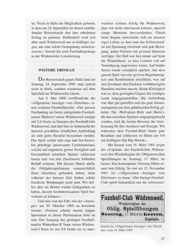 Am 8. Mai 1900 veröffentliche der «Allgemeine Anzeiger vom Zürichsee» einen weiteren Fussballbericht: «Der gestern Nachmittag im Geren stattgehabte Fussballmatch Thalweil versus Wädensweil endigte mit 2:6 Goals zu Gunsten des Fussballclubs Wädensweil, und darf dies in Anbetracht der äusserst gewählten feindlichen Aufstellung als sehr gutes Resultat bezeichnet werden. Das Spiel verlief sehr rege und bot bisweilen prächtige interessante Combinationen, welche auf ungemein grosse Fertigkeit und Gewandtheit einzelner Spieler schliessen lassen und von den Zuschauern lebhaften Beifall ernteten. Mit diesem Match dürfte die Frühjahrsspielsaison voraussichtlich ihren Abschluss gefunden haben, denn während der heissen Zeit finden solche friedliche Wettkämpfe nicht statt. Wir hoffen aber im Herbst wieder Gelegenheit zu haben, diesem hochinteressanten Spiel beiwohnen zu können.»