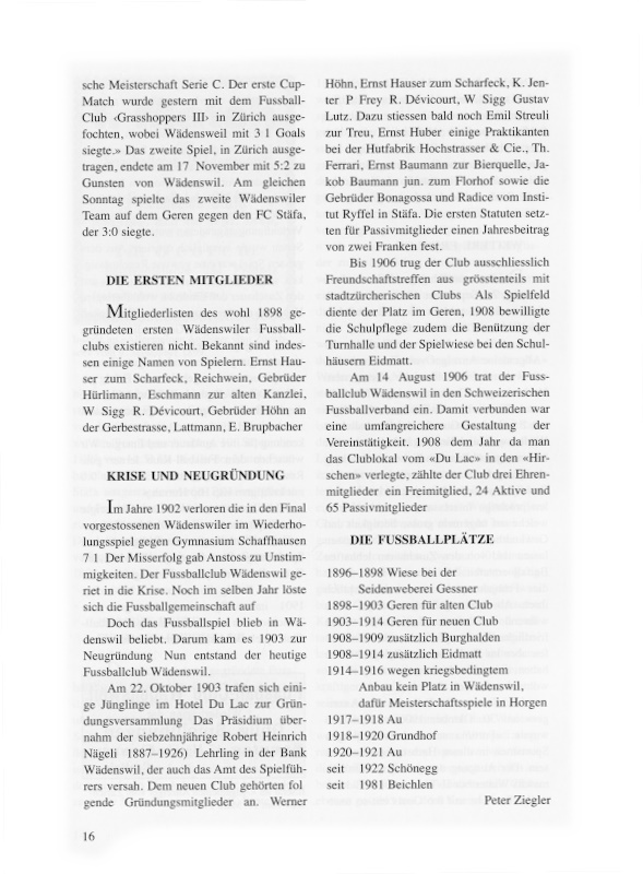 «Der vor 1½ Jahren gegründete Fussballclub Wädensweil erfreut sich gegenwärtig einer ordentlich grossen Mitgliederzahl und hat trotz der geringen Sympathie von Seiten der Einwohnerschaft schon ganz bedeutende Fortschritte gemacht. Unter diesen ist besonders der 1. Match hervorzuheben, der nur durch die Ausdauer der Mitglieder zustande kam. Gestern, den 10. September 1899, konnte sich der Fussballclub Wädensweil im Geren in Hier in ein solches Wettspiel einlassen. Als Gegner stand ihm gegenüber der Fussballclub Stäfa, dessen Bestand (ca. 1 Jahr) auch nicht weit zurück greift. Infolge der etwas unbeständigen, doch für einen Match aussergewöhnlich günstigen Witterung nahm derselbe schon um ½3 Uhr seinen Anfang. Während Stäfa von einigen gewandten Spielern unterstützt wurde, welche die weniger geübten Mitglieder zum siegreichen Vorgehen anspornten, war in den Reihen der Wädensweiler stets eine bessere Kombination zu beobachten, die nur durch die Übung der einzelnen weniger guten Spieler bedingt wurde. Wohl waren es die Stäfner, welche den Ball zuerst durch das feindliche Goal trieben, aber die Wädensweiler Mannschaft liess diesen Vorstoss nicht lange ungerächt. Dem guten Miteinanderarbeiten der Wädensweiler Stürmer ist es zu verdanken, dass auch sie den Ball durch das verhängnisvolle Goal warfen. Lange Zeit blieb nun dieses Resultat unverändert, bis es endlich einem einzelnen Spieler des Fussballclubs Stäfa gelang, wieder einen Vorstoss gegen das Wädensweiler Goal zu machen, dem aber bald zwei Gegenstösse der Wädensweiler folgten. Die Zeit war verstrichen, zweimal 40 Minuten hatten beide Parteien mit aller Anstrengung gekämpft und da, wie vorauszusehen war, beide Gegner angenähert über dieselbe Kraft verfügten, konnte auch das Endresultat kaum für die eine Partei sehr günstig lauten. Mit drei gegen zwei Goal hatte denn auch Wädensweil gesiegt, und mit einem kräftigen Hip-hip-hurrah fand der Match seinen Abschluss.
