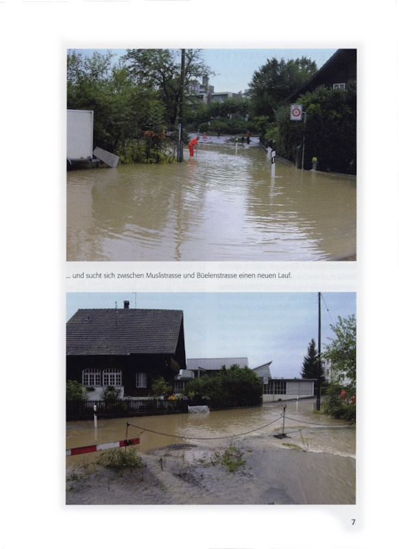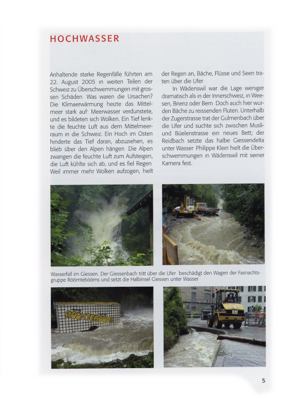Anhaltende starke Regenfälle führten am 22. August 2005 in weiten Teilen der Schweiz zu Überschwemmungen mit grossen Schäden. Was waren die Ursachen? Die Klimaerwärmung heizte das Mittelmeer stark auf; Meerwasser verdunstete, und es bildeten sich Wolken. Ein Tief lenkte die feuchte Luft aus dem Mittelmeerraum in die Schweiz. Ein Hoch im Osten hinderte das Tief daran, abzuziehen; es blieb über den Alpen hängen. Die Alpen zwangen die feuchte Luft zum Aufsteigen; die Luft kühlte sich ab, und es fiel Regen. Weil immer mehr Wolken aufzogen, hielt der Regen an, Bäche, Flüsse und Seen traten über die Ufer. In Wädenswil war die Lage weniger dramatisch als in der Innerschweiz, in Weesen, Brienz oder Bern. Doch auch hier wurden Bäche zu reissenden Fluten. Unterhalb der Zugerstrasse trat der Gulmenbach über die Ufer und suchte sich zwischen Musli- und Büelenstrasse ein neues Bett; der Reidbach setzte das halbe Giessendelta unter Wasser. Philippe Klein hielt die Überschwemmungen in Wädenswil mit seiner Kamera fest.