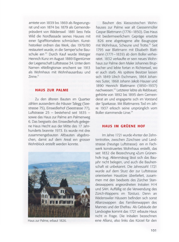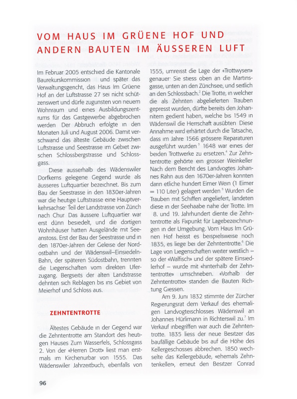 Die Jahreszahl 1721 wurde auf dem Sturz der zur Luftstrasse orientierten Haustüre überliefert, zusammen mit den beidseits des Zürcher Standeswappens angeordneten Initialen HIH und SAH. Auffällig ist die Verwendung des Zürich-Wappens im Türsturz. Denn an Wädenswiler Häusern befinden sich sonst Allianzwappen: das Familienwappen des Mannes und der Ehefrau. Als Gebäude der Landvogtei kommt das 1721 erbaute Haus nicht in Frage. Die Initialen bezeichnen eine Allianz, also links das Kürzel für den Mann Hans Jakob H., rechts jenes für die Ehegattin Susanna H. Anhand der Wädenswiler Ehebücher oder der Bevölkerungsverzeichnisse lassen sich die meisten Allianzen deuten.25 In diesen Quellen finden sich zwei Ehen mit den entsprechenden Vornamen: 1684 fand die Heirat zwischen Hans Jakob Hauser und Susanna Hammer statt, und 1723 waren laut Bevölkerungsverzeichnis Jakob Hotz (geb. 1665) und Susanna Haab (geb. 1680) in Wädenswil ansässig.26 Ob eine der beiden Familien in Frage kommt, und allenfalls welche, lässt sich nicht mehr klären.