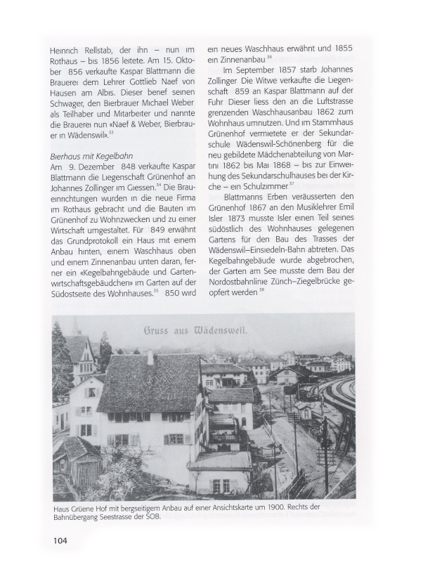 104 Haus Grüene Hof mit bergseitigem Anbau auf einer Ansichtskarte um 1900. Rechts der Bahnübergang Seestrasse der SOB.