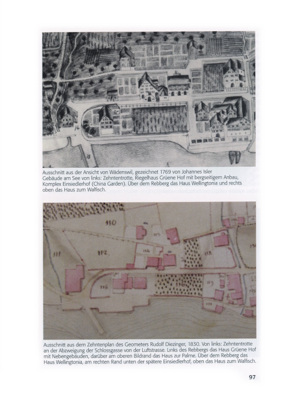 97a Ausschnitt aus der Ansicht von Wädenswil, gezeichnet 1769 von Johannes Isler. Gebäude am See von links: Zehntentrotte, Riegelhaus Grüene Hof mit bergseitigem Anbau, Komplex Einsiedlerhof (China Garden). Über dem Rebberg das Haus Wellingtonia und rechts oben das Haus zum Walfisch.