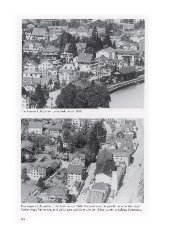 98b Das äussere Luftquartier, Luftaufnahme von 1948. Gut erkennbar die parallel verlaufenden alten Verkehrswege Palmenweg und Luftstrasse und die erst in den 1830er-Jahren angelegte Seestrasse.