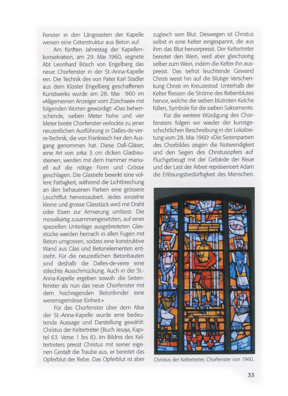 Für das Chorfenster über dem Altar der St.-Anna-Kapelle wurde eine bedeutende Aussage und Darstellung gewählt: Christus der Keltertreter (Buch Jesaja, Kapitel 63, Verse 1 bis 6). Im Bildnis des Keltertreters presst Christus mit seiner eigenen Gestalt die Traube aus; er bereitet das Opferblut der Rebe. Das Opferblut ist aber zugleich sein Blut. Deswegen ist Christus selbst in eine Kelter eingespannt, die aus ihm das Blut hervorpresst. Der Keltertreter bereitet den Wein, wird aber gleichzeitig selber zum Wein, indem die Kelter ihn auspresst. Das tiefrot leuchtende Gewand Christi weist hin auf die blutige Verschenkung Christi im Kreuzestod. Unterhalb der Kelter fliessen die Ströme des Rebenblutes hervor, welche die sieben blutroten Kelche füllen, Symbole für die sieben Sakramente.