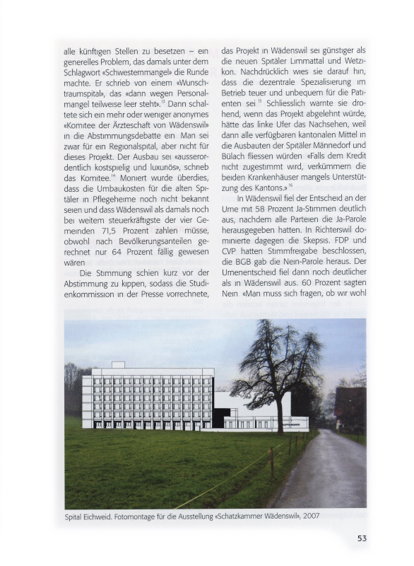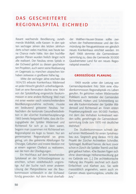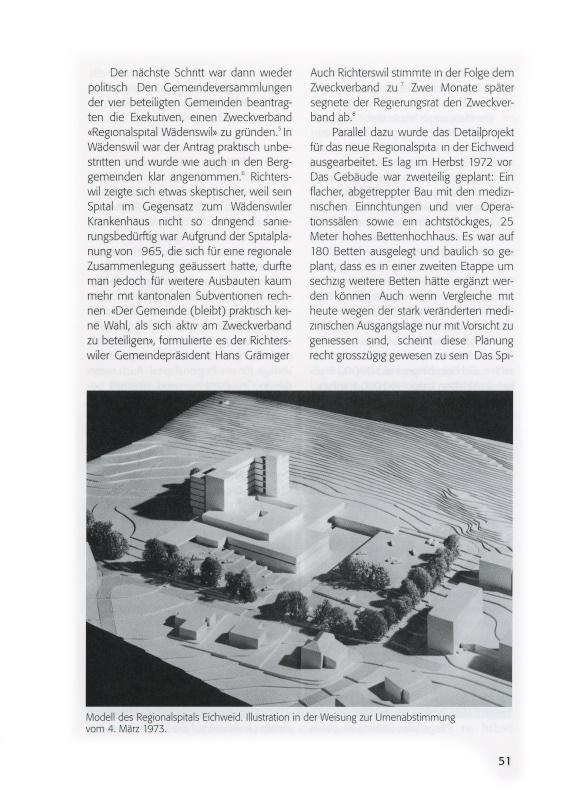 Fritz Störi eine «Studienkommission Regionalspital» ins Leben gerufen. Ihr gehörten neben Wädenswiler Politikern auch Vertreter der Gemeinden Richterswil, Hütten und Schönenberg sowie alle Kadermitarbeiter der Spitäler Wädenswil und Richterswil an. Einen ersten Projektierungskredit von 90000 Franken, mit dem das Vorhaben konkretisiert werden sollte, genehmigte die Gemeindeversammlung Ende Juni 1970 mit deutlicher Mehrheit.