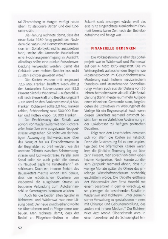 6 Richterswil zeigte sich etwas skeptischer, weil sein Spital im Gegensatz zum Wädenswiler Krankenhaus nicht so dringend sanierungsbedürftig war. Aufgrund der Spitalplanung von 1965, die sich für eine regionale Zusammenlegung geäussert hatte, durfte man jedoch für weitere Ausbauten kaum mehr mit kantonalen Subventionen rechnen. «Der Gemeinde (bleibt) praktisch keine Wahl, als sich aktiv am Zweckverband zu beteiligen», formulierte es der Richterswiler Gemeindepräsident Hans Grämiger. Auch Richterswil stimmte in der Folge dem Zweckverband zu.