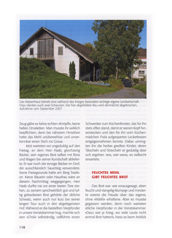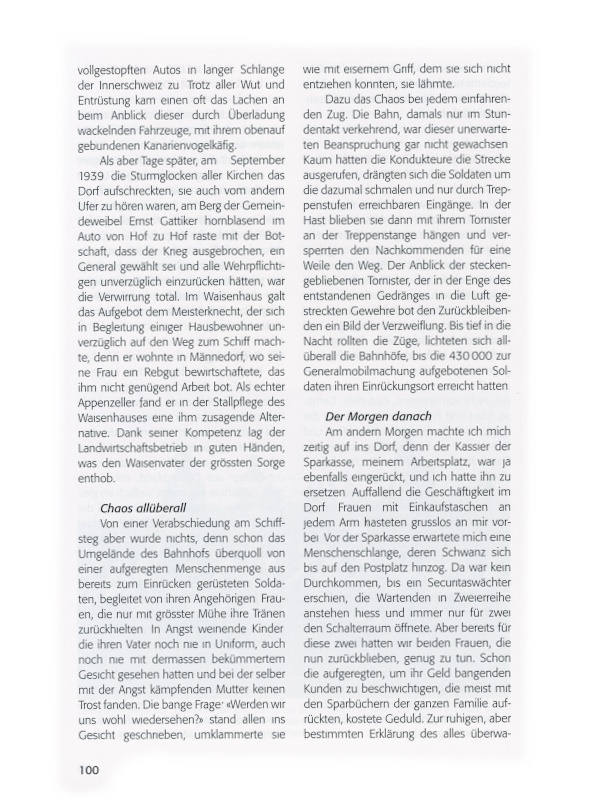 Als aber Tage später, am 1. September 1939, die Sturmglocken aller Kirchen das Dorf aufschreckten, sie auch vom andern Ufer zu hören waren, am Berg der Gemeindeweibel Ernst Gattiker hornblasend im Auto von Hof zu Hof raste mit der Botschaft, dass der Krieg ausgebrochen, ein General gewählt sei und alle Wehrpflichtigen unverzüglich einzurücken hätten, war die Verwirrung total. Im Waisenhaus galt das Aufgebot dem Meisterknecht, der sich in Begleitung einiger Hausbewohner unverzüglich auf den Weg zum Schiff machte, denn er wohnte in Männedorf, wo seine Frau ein Rebgut bewirtschaftete, das ihm nicht genügend Arbeit bot. Als echter Appenzeller fand er in der Stallpflege des Waisenhauses eine ihm zusagende Alternative. Dank seiner Kompetenz lag der Landwirtschaftsbetrieb in guten Händen, was den Waisenvater der grössten Sorge enthob.