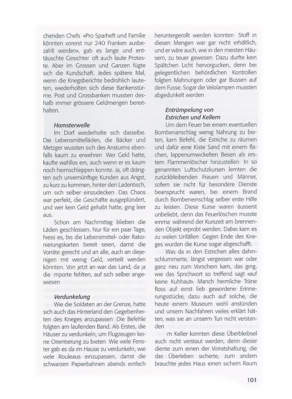 Am andern Morgen machte ich mich zeitig auf ins Dorf, denn der Kassier der Sparkasse, meinem Arbeitsplatz, war ja ebenfalls eingerückt, und ich hatte ihn zu ersetzen. Auffallend die Geschäftigkeit im Dorf. Frauen mit Einkaufstaschen an jedem Arm hasteten grusslos an mir vorbei. Vor der Sparkasse erwartete mich eine Menschenschlange, deren Schwanz sich bis auf den Postplatz hinzog. Da war kein Durchkommen, bis ein Securitaswächter erschien, die Wartenden in Zweierreihe anstehen hiess und immer nur für zwei den Schalterraum öffnete. Aber bereits für diese zwei hatten wir beiden Frauen, die nun zurückblieben, genug zu tun. Schon die aufgeregten, um ihr Geld bangenden Kunden zu beschwichtigen, die meist mit den Sparbüchern der ganzen Familie aufrückten, kostete Geduld. Zur ruhigen, aber bestimmten Erklärung des alles überwachenden Chefs: «Pro Sparheft und Familie könnten vorerst nur 240 Franken ausbezahlt werden», gab es lange und enttäuschte Gesichter, oft auch laute Proteste. Aber im Grossen und Ganzen fügte sich die Kundschaft. Jedes spätere Mal, wenn die Kriegsberichte bedrohlich lauteten, wiederholten sich diese Bankenstürme. Post und Grossbanken mussten deshalb immer grössere Geldmengen bereithalten.