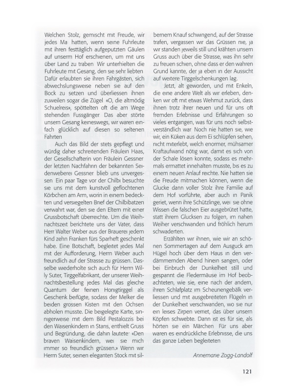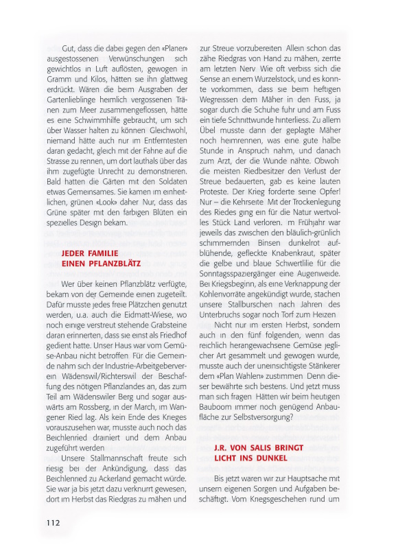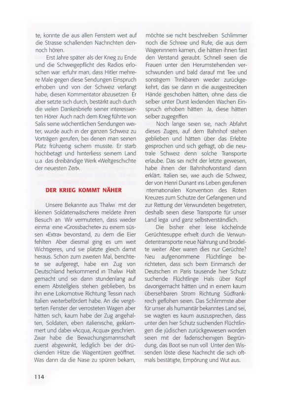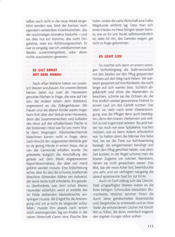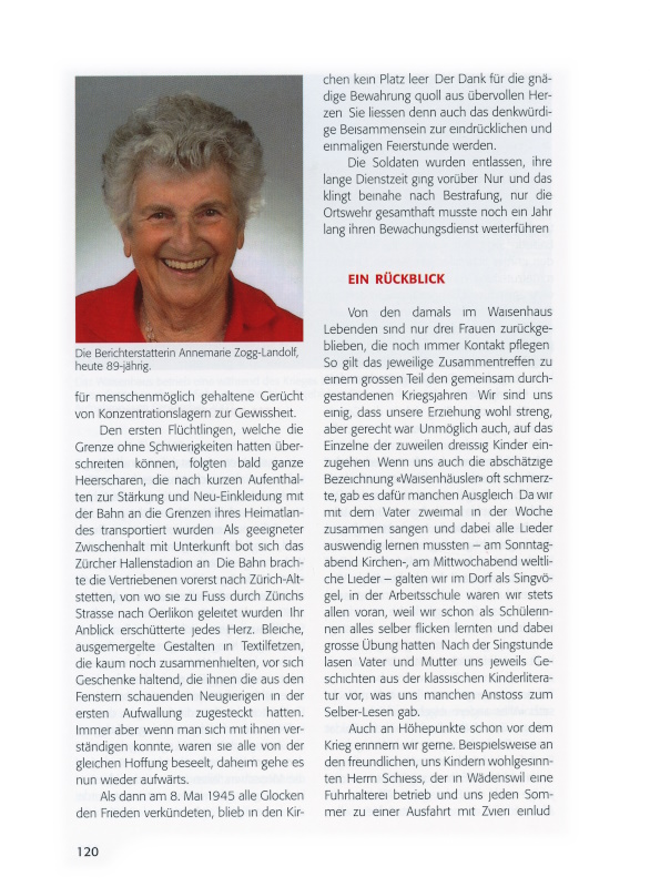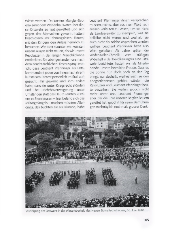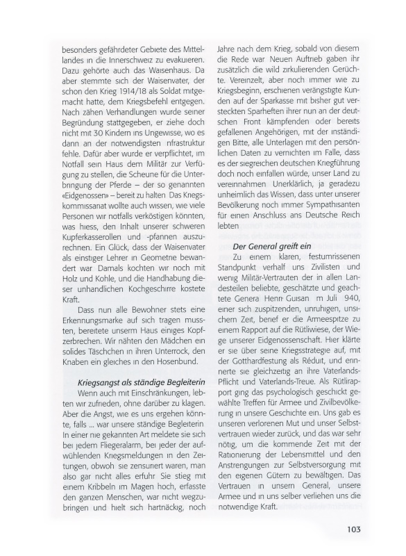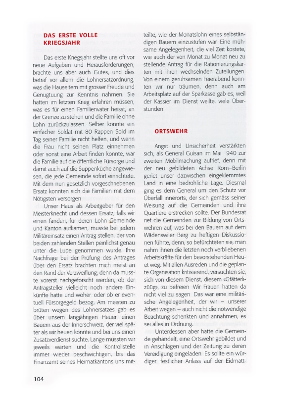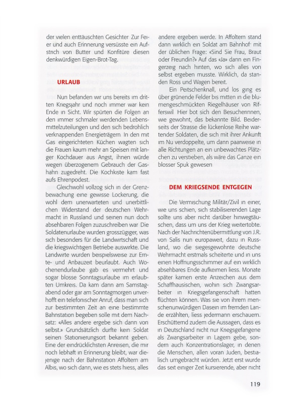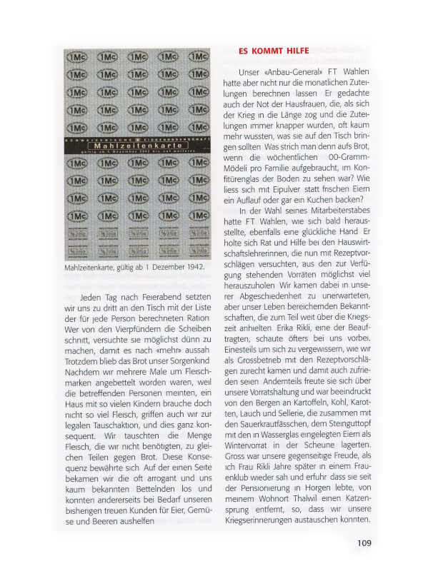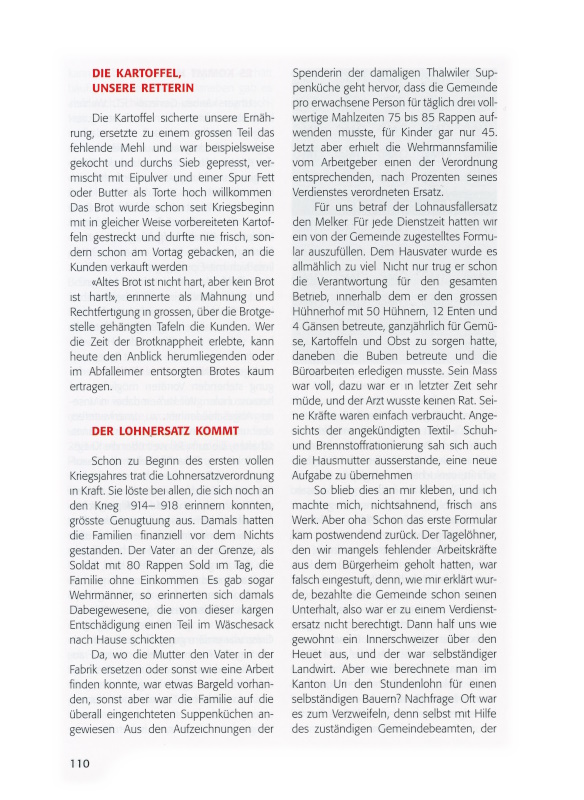 Der nachfolgende Bericht möchte keineswegs den grossen, während sechs Jahren um unser Land tobenden Krieg beschreiben. Er möchte einfach zeigen, wie sich der Alltag mit allen Sorgen, Lasten und Entbehrungen, die sich in der Folge ergaben, hinter der Front abspielte. Wie sich unser Land trotz Abriegelung und gänzlich fehlender Importe behauptete, sich seine Selbstversorgung auf- und ausbaute und sich in selbstbestimmter Einigkeit trotz vieler Verzichte hilfsbereit zeigte. Wer diese Zeit miterlebte, möchte diese Einigkeit und Solidarität gerne wieder zurückhaben.