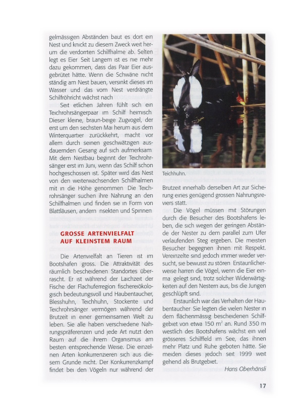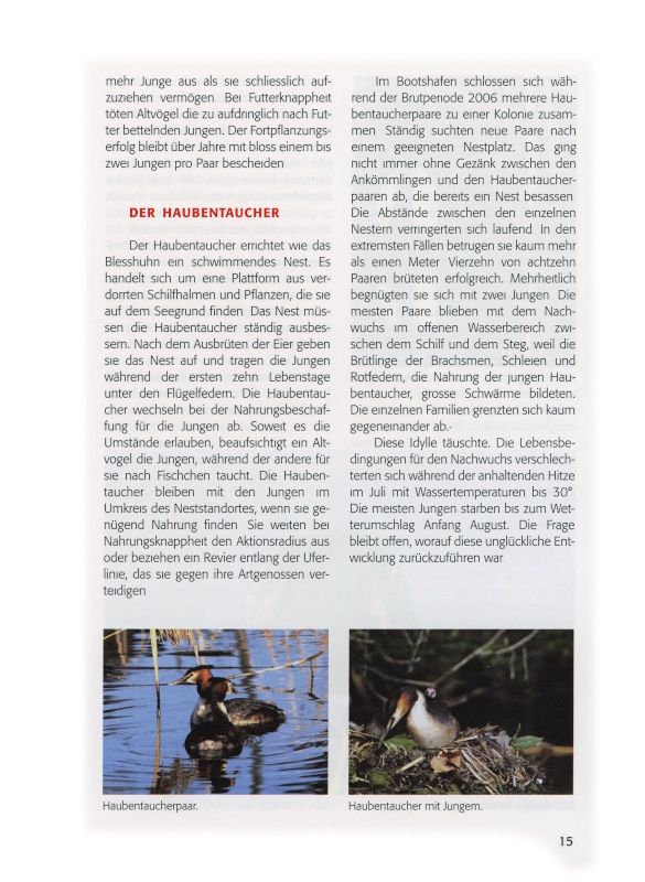 Im Bootshafen schlossen sich während der Brutperiode 2006 mehrere Haubentaucherpaare zu einer Kolonie zusammen. Ständig suchten neue Paare nach einem geeigneten Nestplatz. Das ging nicht immer ohne Gezänk zwischen den Ankömmlingen und den Haubentaucherpaaren ab, die bereits ein Nest besassen. Die Abstände zwischen den einzelnen Nestern verringerten sich laufend. In den extremsten Fällen betrugen sie kaum mehr als einen Meter. Vierzehn von achtzehn Paaren brüteten erfolgreich. Mehrheitlich begnügten sie sich mit zwei Jungen. Die meisten Paare blieben mit dem Nachwuchs im offenen Wasserbereich zwischen dem Schilf und dem Steg, weil die Brütlinge der Brachsmen, Schleien und Rotfedern, die Nahrung der jungen Haubentaucher, grosse Schwärme bildeten. Die einzelnen Familien grenzten sich kaum gegeneinander ab.