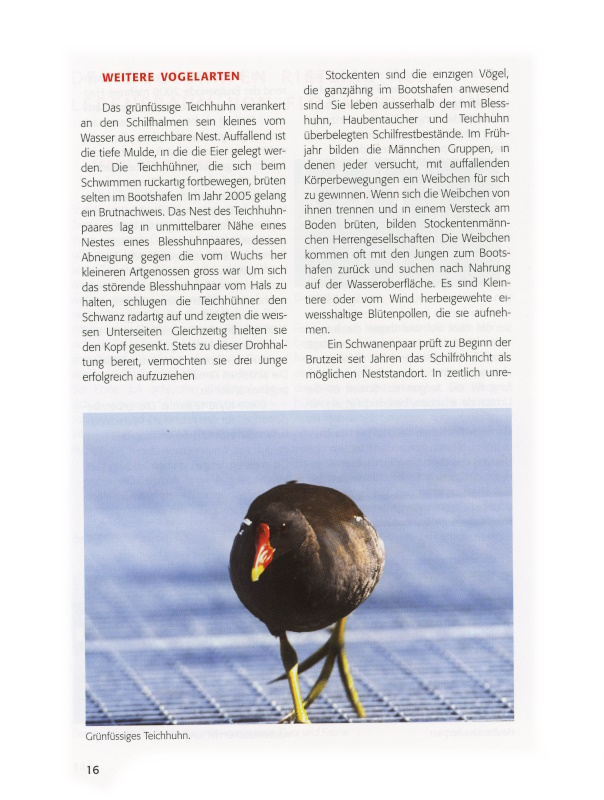 Das grünfüssige Teichhuhn verankert an den Schilfhalmen sein kleines vom Wasser aus erreichbare Nest. Auffallend ist die tiefe Mulde, in die die Eier gelegt werden. Die Teichhühner, die sich beim Schwimmen ruckartig fortbewegen, brüten selten im Bootshafen. Im Jahr 2005 gelang ein Brutnachweis. Das Nest des Teichhuhnpaares lag in unmittelbarer Nähe eines Nestes eines Blesshuhnpaares, dessen Abneigung gegen die vom Wuchs her kleineren Artgenossen gross war. Um sich das störende Blesshuhnpaar vom Hals zu halten, schlugen die Teichhühner den Schwanz radartig auf und zeigten die weissen Unterseiten. Gleichzeitig hielten sie den Kopf gesenkt. Stets zu dieser Drohhaltung bereit, vermochten sie drei Junge erfolgreich aufzuziehen.
