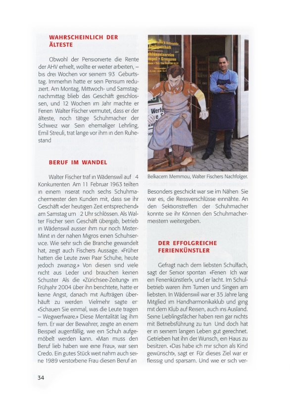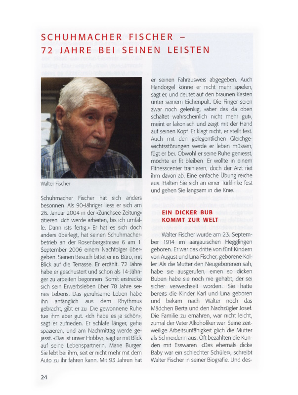 Schuhmacher Fischer hat sich anders besonnen. Als 90-Jähriger liess er sich am 26. Januar 2004 in der «Zürichsee-Zeitung» zitieren: «Ich werde arbeiten, bis ich umfalle. Dann ists fertig.» Er hat es sich doch anders überlegt, hat seinen Schuhmacherbetrieb an der Rosenbergstrasse 6 am 1. September 2006 einem Nachfolger übergeben. Seinen Besuch bittet er ins Büro, mit Blick auf die Terrasse. Er erzählt. 72 Jahre habe er geschustert und schon als 14-Jähriger zu arbeiten begonnen. Somit erstrecke sich sein Erwerbsleben über 78 Jahre seines Lebens. Das geruhsame Leben habe ihn anfänglich aus dem Rhythmus gebracht, gibt er zu. Die gewonnene Ruhe tue ihm aber gut. «Ich habe es ja schön», sagt er zufrieden. Er schlafe länger, gehe spazieren, und am Nachmittag werde gejasst. «Das ist unser Hobby», sagt er mit Blick auf seine Lebenspartnerin, Marie Burger. Sie lebt bei ihm, seit er nicht mehr mit dem Auto zu ihr fahren kann. Mit 93 Jahren hat er seinen Fahrausweis abgegeben. Auch Handorgel könne er nicht mehr spielen, sagt er, und deutet auf den braunen Kasten unter seinem Eichenpult. Die Finger seien zwar noch gelenkig, «aber das da oben schaltet wahrscheinlich nicht mehr gut», meint er lakonisch und zeigt mit der Hand auf seinen Kopf. Er klagt nicht, er stellt fest. Auch mit den gelegentlichen Gleichgewichtsstörungen werde er leben müssen, fügt er bei. Obwohl er seine Ruhe geniesst, möchte er fit bleiben. Er wollte in einem Fitnesscenter trainieren, doch der Arzt riet ihm davon ab. Eine einfache Übung reiche aus: Halten Sie sich an einer Türklinke fest und gehen Sie langsam in die Knie.