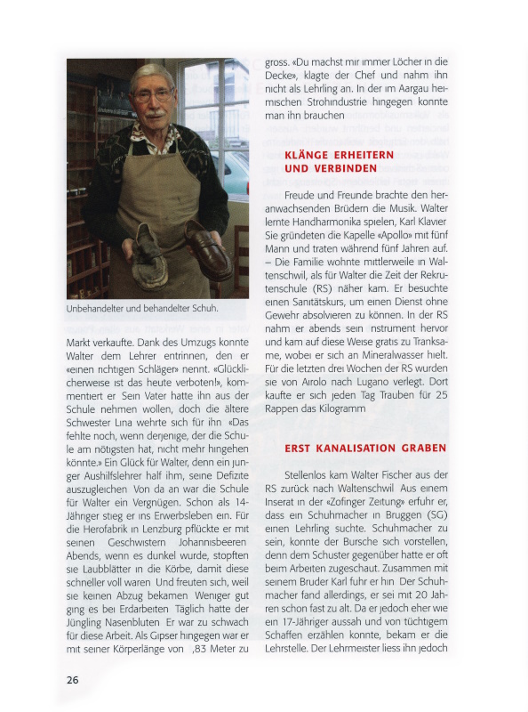 Stellenlos kam Walter Fischer aus der RS zurück nach Waltenschwil. Aus einem Inserat in der «Zofinger Zeitung» erfuhr er, dass ein Schuhmacher in Bruggen (SG) einen Lehrling suchte. Schuhmacher zu sein, konnte der Bursche sich vorstellen, denn dem Schuster gegenüber hatte er oft beim Arbeiten zugeschaut. Zusammen mit seinem Bruder Karl fuhr er hin. Der Schuhmacher fand allerdings, er sei mit 20 Jahren schon fast zu alt. Da er jedoch eher wie ein 17-Jähriger aussah und von tüchtigem Schaffen erzählen konnte, bekam er die Lehrstelle. Der Lehrmeister liess ihn jedoch die ersten drei Wochen die Gräben für die Kanalisation buddeln. Dafür erliess er ihm das geforderte Lehrgeld von 600 Franken, bei freier Kost und Logis. Pro Woche erhielt der Lehrling Sackgeld. Im ersten Jahr einen, im zweiten Jahr zwei und im dritten Jahren drei Franken. Oft musste er den Meister stupfen, dass er seine «Fränkli» wirklich bekam. Auch das Essen war so knapp, dass der junge Mann oft in der Bäckerei gegenüber ein «Bürli» kaufte, damit er beim Arbeiten nicht vom Stuhl falle.