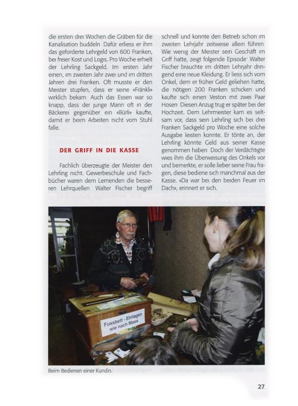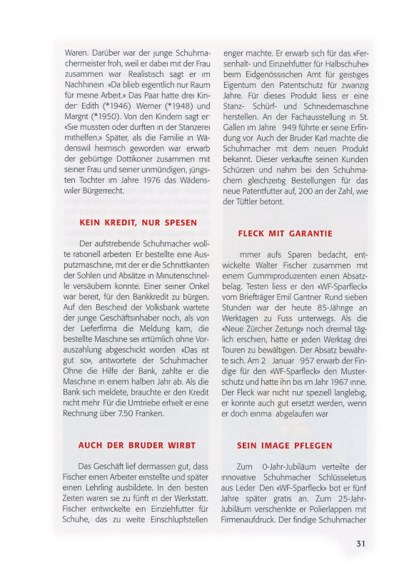 Der aufstrebende Schuhmacher wollte rationell arbeiten. Er bestellte eine Ausputzmaschine, mit der er die Schnittkanten der Sohlen und Absätze in Minutenschnelle versäubern konnte. Einer seiner Onkel war bereit, für den Bankkredit zu bürgen. Auf den Bescheid der Volksbank wartete der junge Geschäftsinhaber noch, als von der Lieferfirma die Meldung kam, die bestellte Maschine sei irrtümlich ohne Vorauszahlung abgeschickt worden. «Das ist gut so», antwortete der Schuhmacher. Ohne die Hilfe der Bank, zahlte er die Maschine in einem halben Jahr ab. Als die Bank sich meldete, brauchte er den Kredit nicht mehr. Für die Umtriebe erhielt er eine Rechnung über 7.50 Franken.