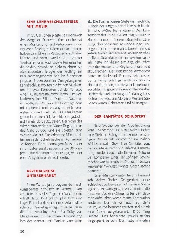 Eine Woche vor der Mobilmachung vom 1. September 1939 trat Walter Fischer eine Stelle in Zofingen an. Seinen einjährigen Aktivdienst leistete er im nahen Wohlenschwil. Obwohl er Sanitäter war, behandelte er nicht nur verletzte Kameraden, sondern auch die lädierten Schuhe der Kompanie. Einer der Zofinger Schuhmacher war ebenfalls im Dienst. In dessen verwaisten Werkstatt konnte Walter Fischer hantieren.