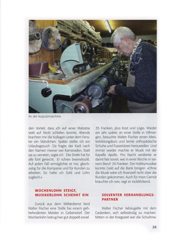 Zurück aus dem Militärdienst fand Walter Fischer eine Stelle bei einem gehbehinderten Meister in Gebenstorf. Der Wochenlohn betrug hier gut doppelt soviel: 35 Franken, plus Kost und Logis. Wieder ein Jahr später, an einer Stelle in Villmergen, besuchte Walter Fischer einen Meisterbildungskurs und lernte orthopädische Schuhe und Fussstützen herzustellen. Und immer wieder machte er Musik mit der Kapelle Apollo. Pro Nacht verdiente er damit fast soviel, wie in einer Woche in seinem Beruf: 30 Franken. Der Hobbymusiker konnte Geld auf die Bank bringen: «Ohne die Musik wäre ich finanziell nicht über die Runden gekommen. Auch für mein Gemüt brauchte ich sie», sagt er rückblickend.