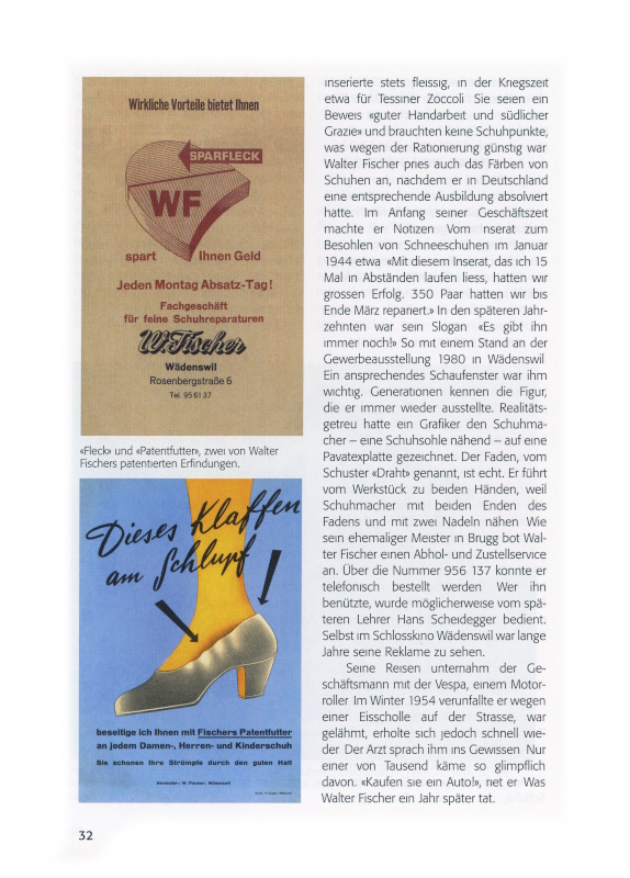 Immer aufs Sparen bedacht, entwickelte Walter Fischer zusammen mit einem Gummiproduzenten einen Absatzbelag. Testen liess er den «WF-Sparfleck» vom Briefträger Emil Gantner. Rund sieben Stunden war der heute 85-Jährige an Werktagen zu Fuss unterwegs. Als die «Neue Zürcher Zeitung» noch dreimal täglich erschien, hatte er jeden Werktag drei Touren zu bewältigen. Der Absatz bewährte sich. Am 21. Januar 1957 erwarb der Findige für den «WF-Sparfleck» den Musterschutz und hatte ihn bis im Jahr 1967 inne. Der Fleck war nicht nur speziell langlebig, er konnte auch gut ersetzt werden, wenn er doch einmal abgelaufen war.