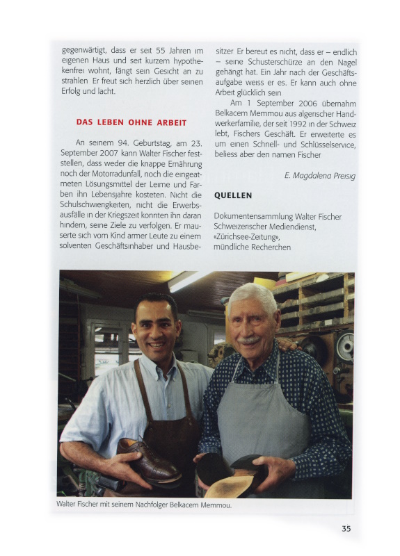An seinem 94. Geburtstag, am 23. September 2007, kann Walter Fischer feststellen, dass weder die knappe Ernährung noch der Motorradunfall, noch die eingeatmeten Lösungsmittel der Leime und Farben ihn Lebensjahre kosteten. Nicht die Schulschwierigkeiten, nicht die Erwerbsausfälle in der Kriegszeit konnten ihn daran hindern, seine Ziele zu verfolgen. Er mauserte sich vom Kind armer Leute zu einem solventen Geschäftsinhaber und Hausbesitzer. Er bereut es nicht, dass er – endlich – seine Schusterschürze an den Nagel gehängt hat. Ein Jahr nach der Geschäftsaufgabe weiss er es: Er kann auch ohne Arbeit glücklich sein.
