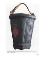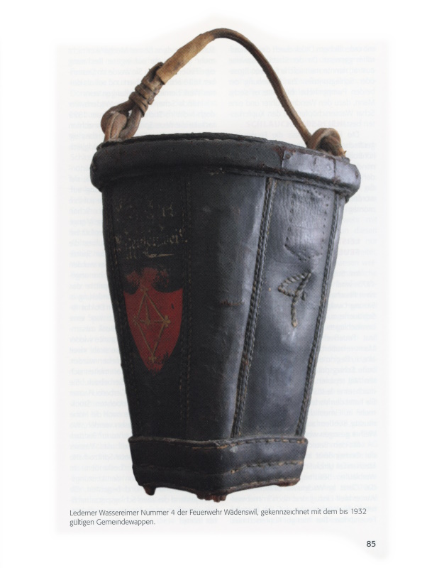 85 Lederner Wassereimer Nummer 4 der Feuerwehr Wädenswil, gekennzeichnet mit dem bis 1932 gültigen Gemeindewappen.