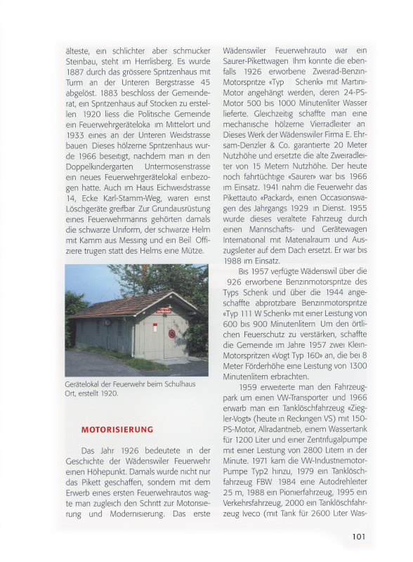 Das Jahr 1926 bedeutete in der Geschichte der Wädenswiler Feuerwehr einen Höhepunkt. Damals wurde nicht nur das Pikett geschaffen, sondern mit dem Erwerb eines ersten Feuerwehrautos wagte man zugleich den Schritt zur Motorisierung und Modernisierung. Das erste Wädenswiler Feuerwehrauto war ein Saurer-Pikettwagen. Ihm konnte die ebenfalls 1926 erworbene Zweirad-Benzin-Motorspritze «Typ II Schenk» mit Martini-Motor angehängt werden, deren 24-PS-Motor 500 bis 1000 Minutenliter Wasser lieferte. Gleichzeitig schaffte man eine mechanische hölzerne Vierradleiter an. Dieses Werk der Wädenswiler Firma E. Ehrsam-Denzler & Co. garantierte 20 Meter Nutzhöhe und ersetzte die alte Zweiradleiter von 15 Metern Nutzhöhe. Der heute noch fahrtüchtige «Saurer» war bis 1966 im Einsatz. 1941 nahm die Feuerwehr das Pikettauto «Packard», einen Occasionswagen des Jahrgangs 1929, in Dienst. 1955 wurde dieses veraltete Fahrzeug durch einen Mannschafts- und Gerätewagen International mit Materialraum und Auszugsleiter auf dem Dach ersetzt. Er war bis 1988 im Einsatz.