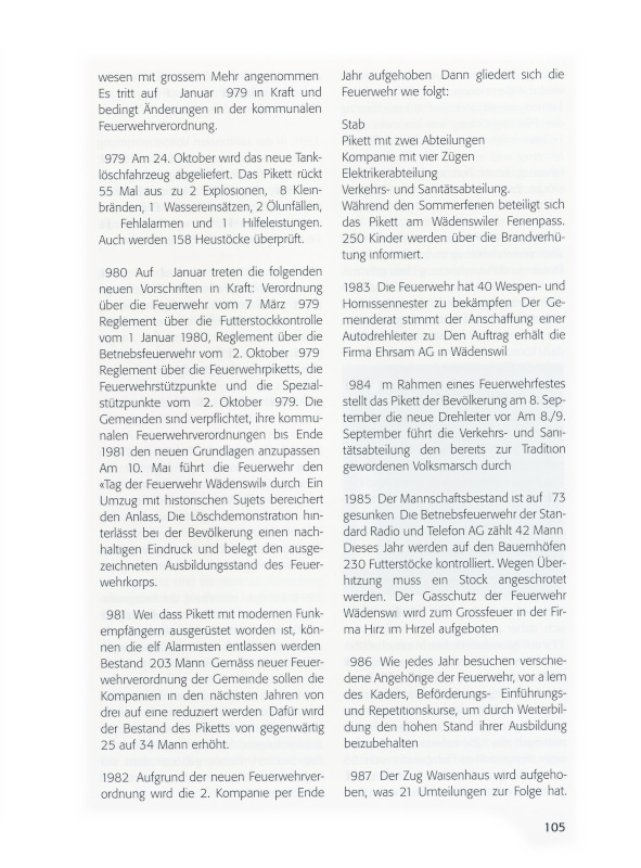 Auf 1. Januar treten die folgenden neuen Vorschriften in Kraft: Verordnung über die Feuerwehr vom 7. März 1979; Reglement über die Futterstockkontrolle vom 1. Januar 1980; Reglement über die Betriebsfeuerwehr vom 12. Oktober 1979; Reglement über die Feuerwehrpiketts, die Feuerwehrstützpunkte und die Spezialstützpunkte vom 12. Oktober 1979. Die Gemeinden sind verpflichtet, ihre kommunalen Feuerwehrverordnungen bis Ende 1981 den neuen Grundlagen anzupassen. Am 10. Mai führt die Feuerwehr den «Tag der Feuerwehr Wädenswil» durch. Ein Umzug mit historischen Sujets bereichert den Anlass, Die Löschdemonstration hinterlässt bei der Bevölkerung einen nachhaltigen Eindruck und belegt den ausgezeichneten Ausbildungsstand des Feuerwehrkorps.
